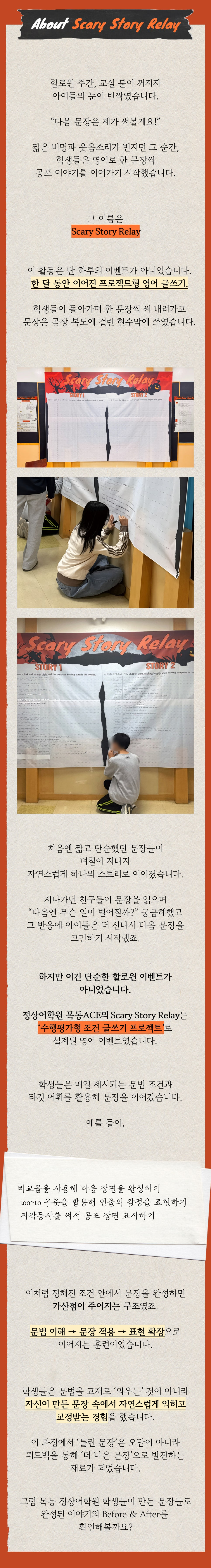 정상어학원 목동ACE의 Scary Story Relay는 ‘수행평가형 조건 글쓰기 프로젝트’로 설계된 영어 수업이었습니다.