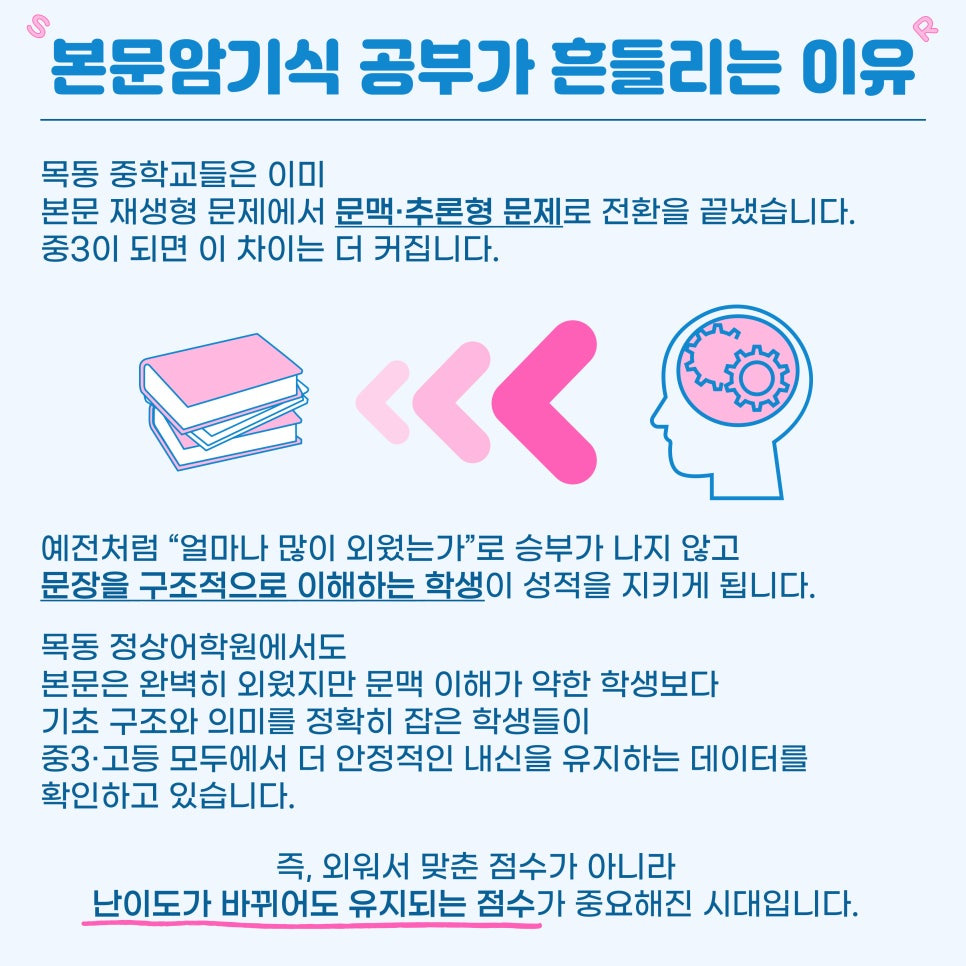 목동 중학교들은 이미 본문 재생형 문제에서 문맥·추론형 문제로 전환을 끝냈습니다.
