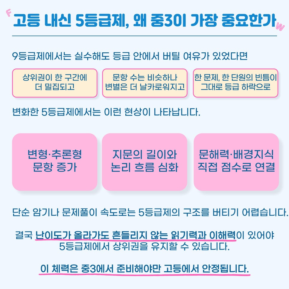중3은 단순히 ‘중학교의 끝’이 아니라 고등 성적의 시작점입니다. 특히 고등 내신이 9등급제에서 5등급제로 바뀐 첫해를 지나며 “한두 문제의 의미”와 “등급 간 간격”이 완전히 달라졌습니다. 이제는 조금만 흔들려도 등급이 크게 떨어질 수 있고 난도가 올라가도 끝까지 버티는 실력이 무엇보다 중요해졌습니다.