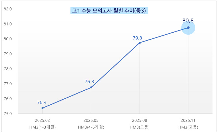 고등 모의고사 난이도에 본격 적응하며 꾸준한 상승 → 11월 80점대 초반 도달