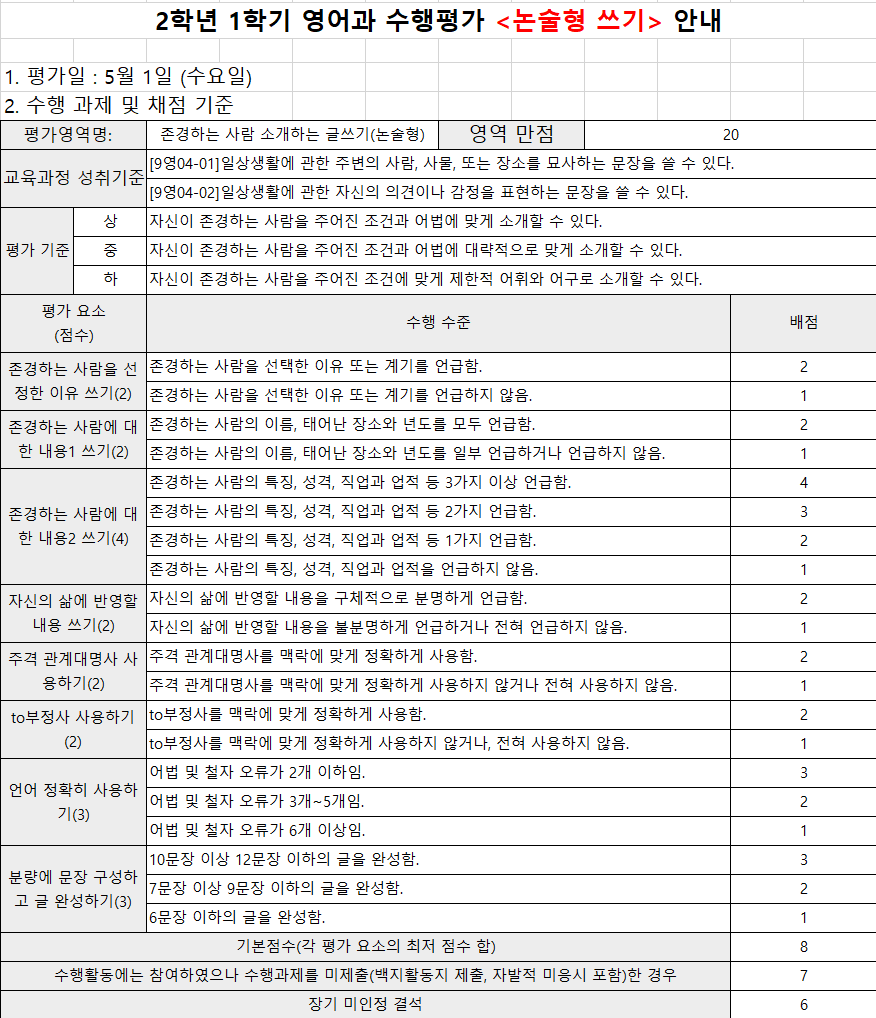 중등 영어 평가에서 중요한 수행평가 글쓰기