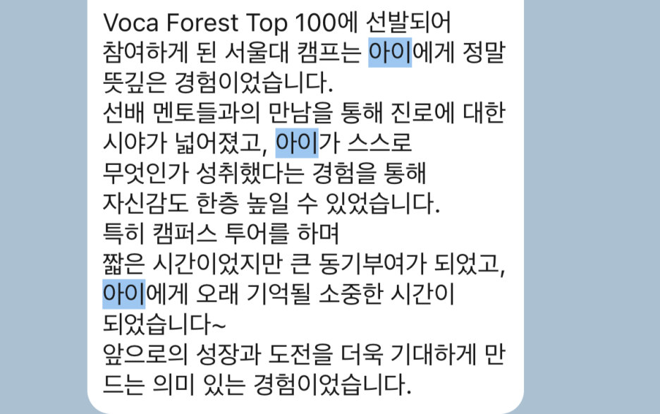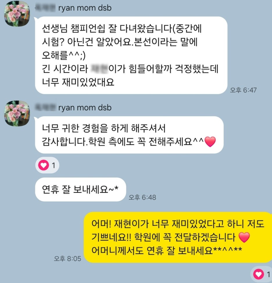 챔피언십 이후 학부모님들께서 보내주신 메시지에서도