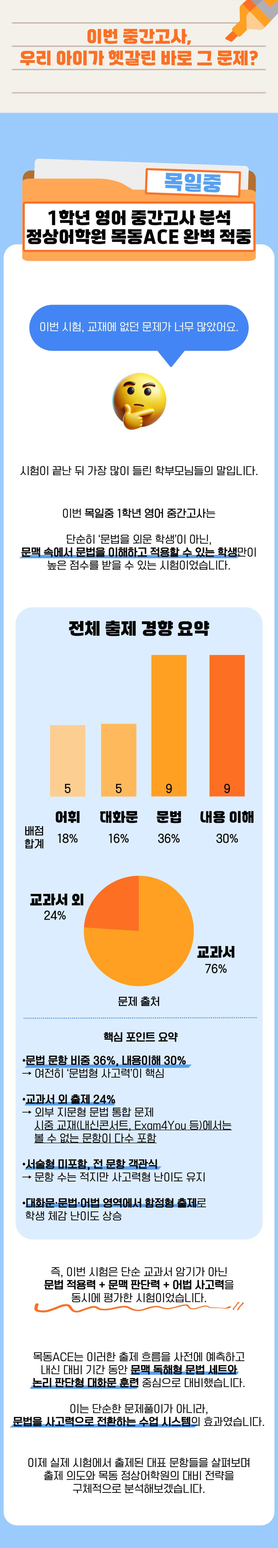 1학년 영어 중간고사 분석 - 목동 정상어학원 완벽 적중