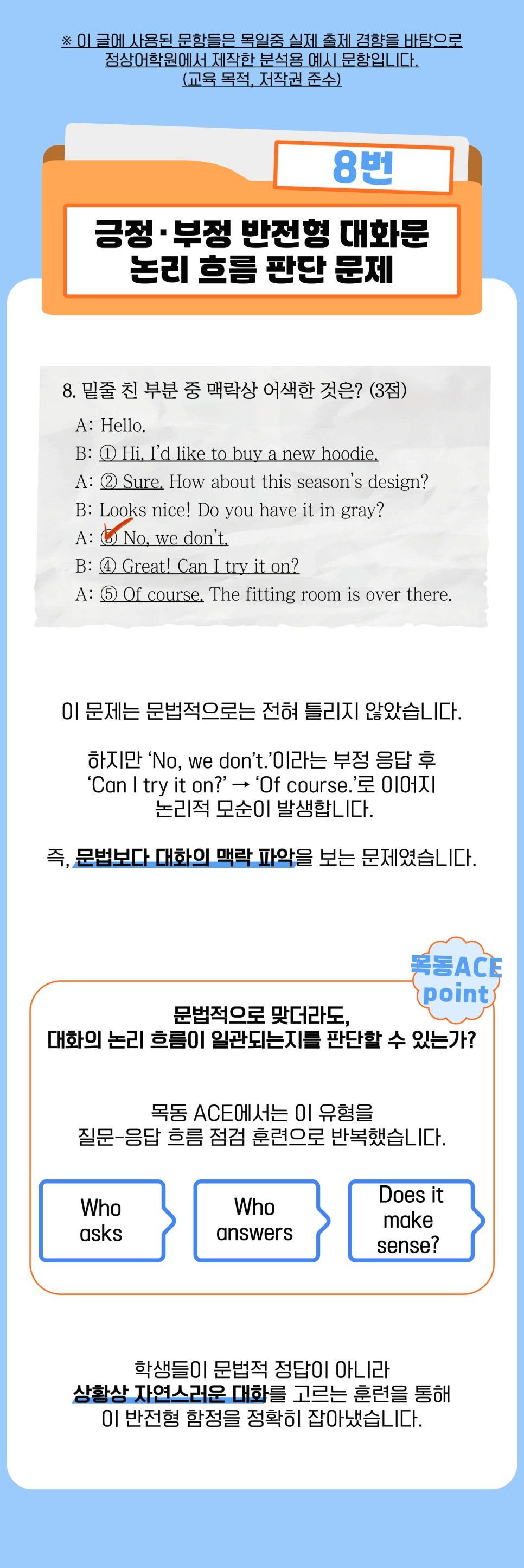 목동 정상어학원은 이러한 출제 흐름을 사전에 예측하고 내신 대비 기간 동안 문맥 독해형 문법 세트와 논리 판단형 대화문 훈련 중심으로 대비했습니다.
