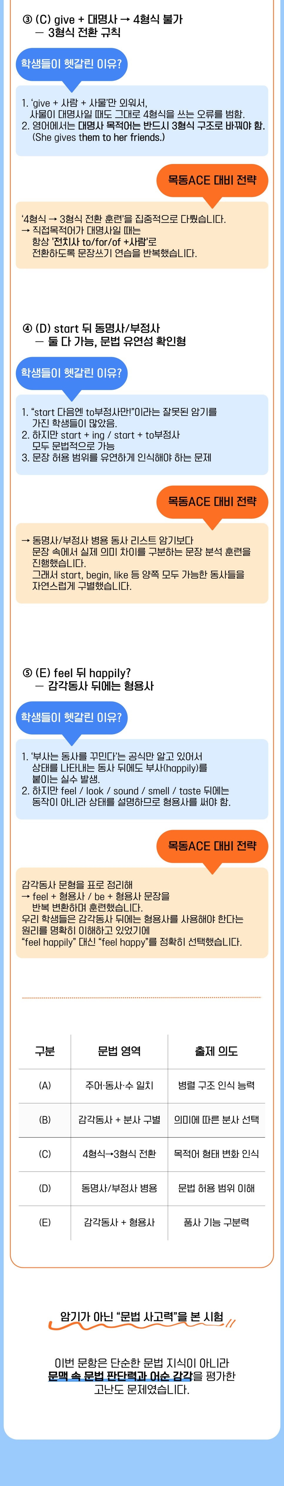 - 규칙 암기가 아닌 문맥 속 문법 적용과 논리 판단 중심 훈련